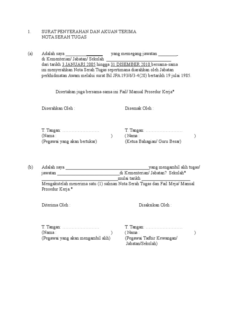 Noraida binti yusof penolong jurutera daerahsenggara jkr batang padang 02 mei 2010 hingga 15 januari 2011. Surat Serahan Tugas Penyerahan Contoh Surat Serah Tugas Serahkan. Mengaku telah menerima satu 1 salinan Nota Serah Tugas dan Fail Meja Manual Prosedur Kerja.